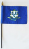 Our 4x6 inch Connecticut Mounted Flags are made of a high quality silk-like 100% polyester and printed in bright bold colors. They feature a hemmed sleeve which is attached to a 24" x 1/4" wooden stick with a spear tip. Each flag is individually sewn around the edges.