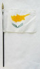 Our 4x6 inch Cyprus Miniature Flags are made of an extremely durable silk-like material and are mounted on a 10.5" black plastic staff with a gilt spearhead. Each flag is individually sewn around the edges. These are perfect for decorating or for waving in a parade to show your national pride.