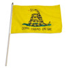 These Gadsen 12" x 18" mounted  historical flags are made of a high quality silk-like polyester with a hemmed sleeve which is attached to a 30" x 5/16" wooden stick with a spear tip.
