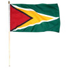 Our 12x18 inch Guyana Mounted Flag 12" x 18' are made of a high quality silk-like polyester with a hemmed sleeve which is attached to a 24" x 1/4" wooden stick Mounted Flags are made of a high quality silk-like 100% polyester and printed in bright bold colors. They feature a hemmed sleeve which is attached to a 24" x 1/4" wooden stick with a spear tip. Each flag is individually sewn around the edges. These are perfect for decorating or for waving in a parade to show your national pride.