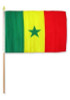 Our 12x18 inch Senegal Mounted Flags are made of a high quality silk-like 100% polyester and printed in bright bold colors. They feature a hemmed sleeve which is attached to a 24" x 1/4" wooden stick with a spear tip. Each flag is individually sewn around the edges. These are perfect for decorating or for waving in a parade to show your national pride.