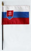 Our 4x6 inch Slovak Republic Mounted Flag 12" x 18" are made of a high quality silk-like polyester with a hemmed sleeve which is attached to a 24" x 1/4" wooden stick Miniature Flags are made of an extremely durable silk-like material and are mounted on a 10.5" black plastic staff with a gilt spearhead. Each flag is individually sewn around the edges. These are perfect for decorating or for waving in a parade to show your national pride.