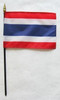 Our 4x6 inch Thailand Miniature Flags are made of an extremely durable silk-like material and are mounted on a 10.5" black plastic staff with a gilt spearhead. Each flag is individually sewn around the edges. These are perfect for decorating or for waving in a parade to show your national pride.