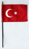 Our 4x6 inch Turkey Miniature Flags are made of an extremely durable silk-like material and are mounted on a 10.5" black plastic staff with a gilt spearhead. Each flag is individually sewn around the edges. These are perfect for decorating or for waving in a parade to show your national pride.